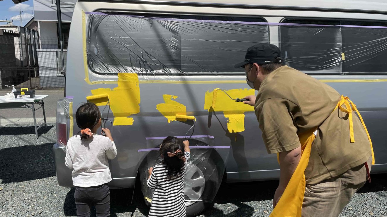 イベントの内容を考えるときは、子どもたちにワクワクを感じてもらえるようなことを考えています。そこで今回思いついたのが、イラストレーターのさいとうゆきこさんが描いてくださった「えほんバス」の絵をもとに、みんなでバスに黄色のペンキを塗るイベント。