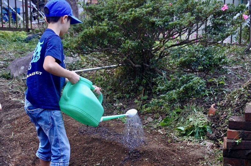 この日の目標は、庭に小さな畑を作り、秋野菜を植えること!