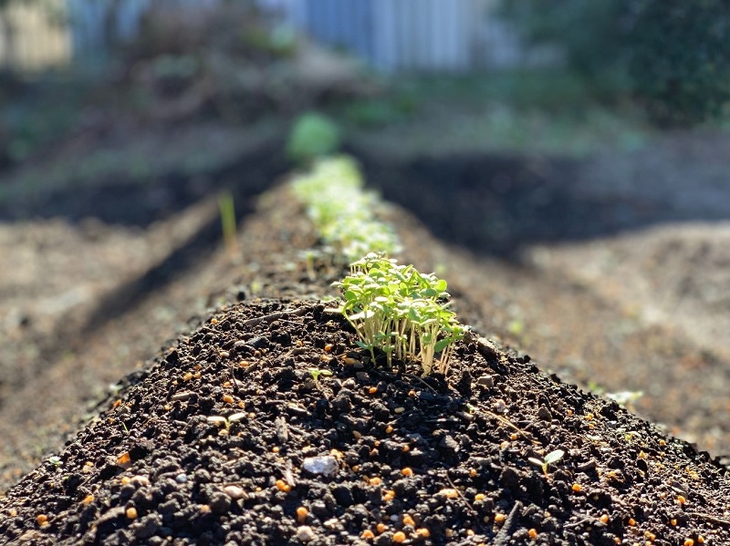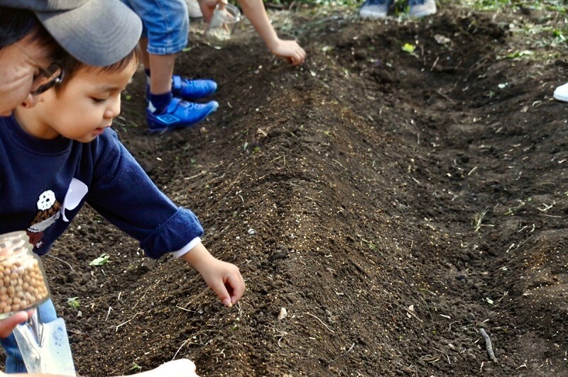 畑の土には指で引いたラインを目印に、一直線上に種を植えます。