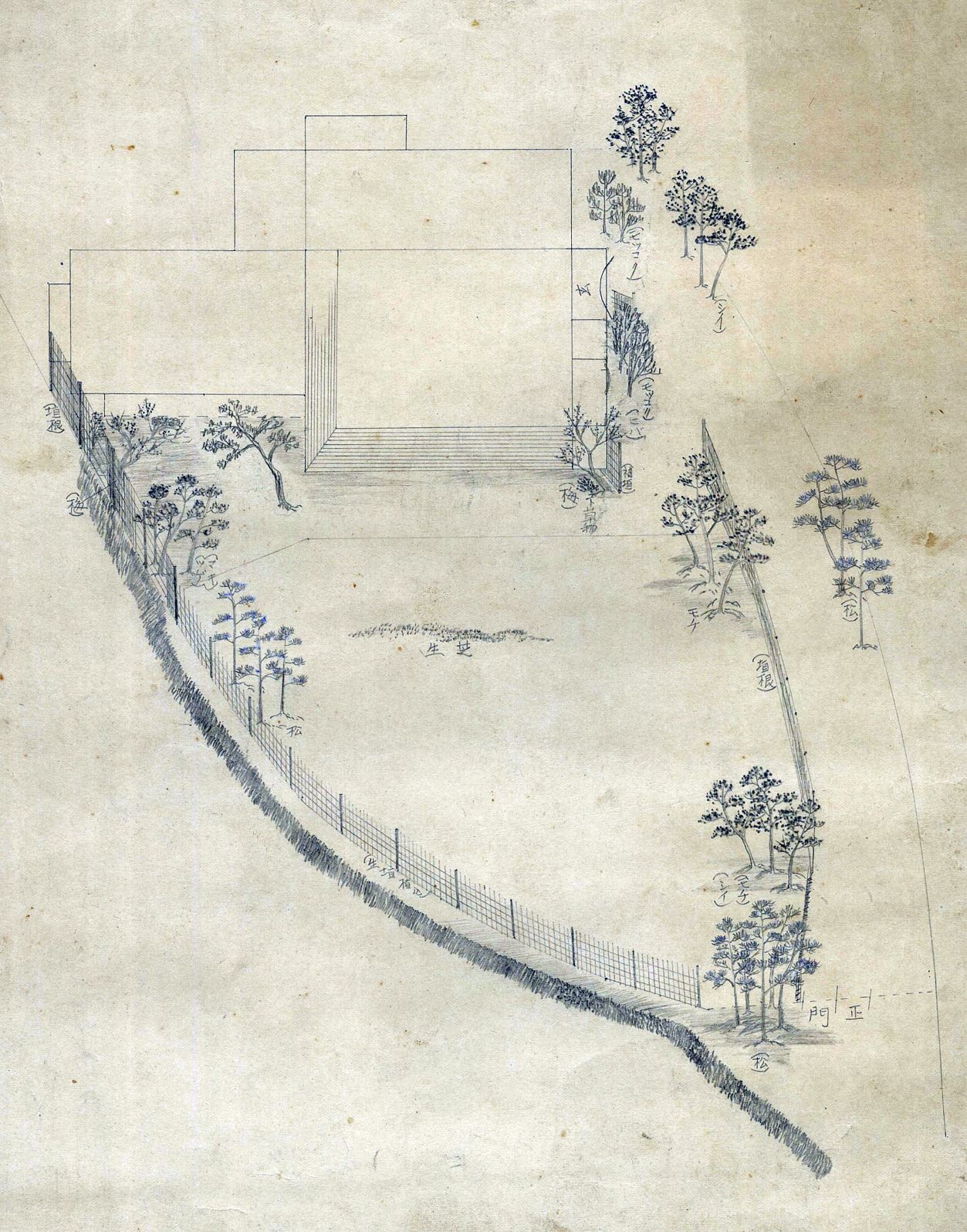 戦時中、庭には畑と防空壕がありました。防空壕がつくられたのは、今の池のあたりです。